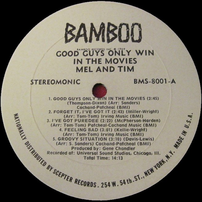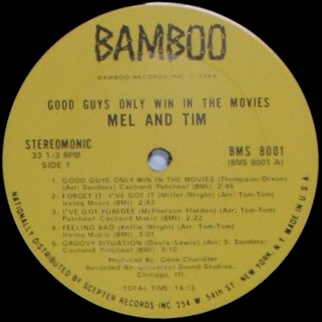 Bamboo Records (USA) was an unrelated American soul label, founded by Yolanda Hardin, the mother of Mel Hardin of R&B duo Mel & Tim. The sole album released on the American Bamboo label was Mel & Tim's "Good Guys Only Win in the Movies", and just about one year after its start, the label was closed again.