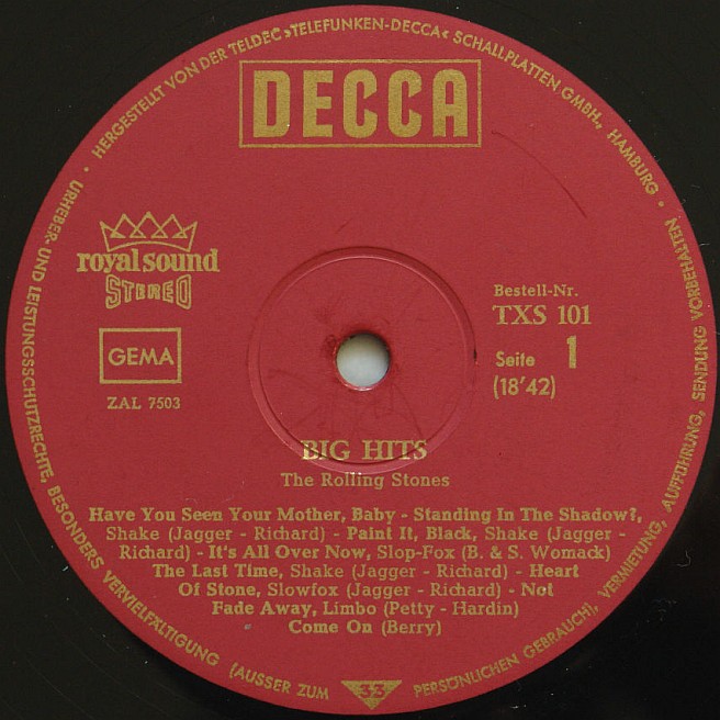 A green, unboxed Decca label was used for the early releases in the TXS-Series, which were stereo pressings. Pre-1968 orginal pressings have the inner groove.