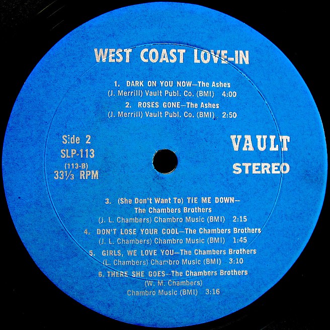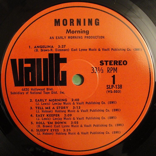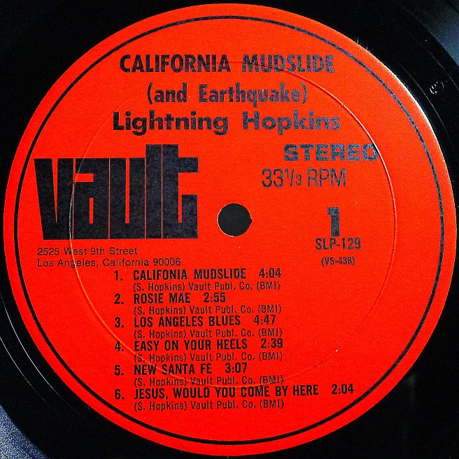 When Vault became a subsidiary of National Tape Distributors, a new label was introduced. The background colour was red with a new VAULT logo left of the center hole and the '2525 West 9th Street, Los Angeles, California 90006' address right below it.